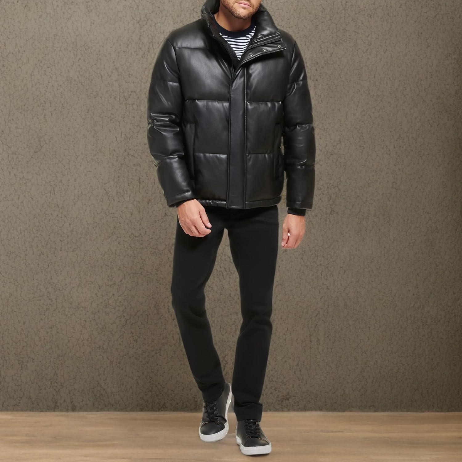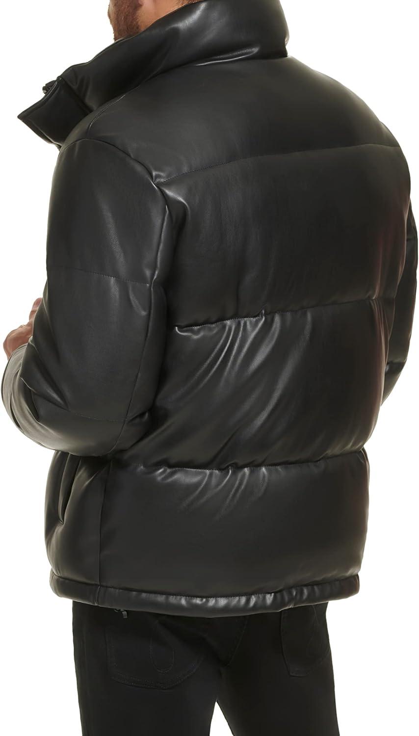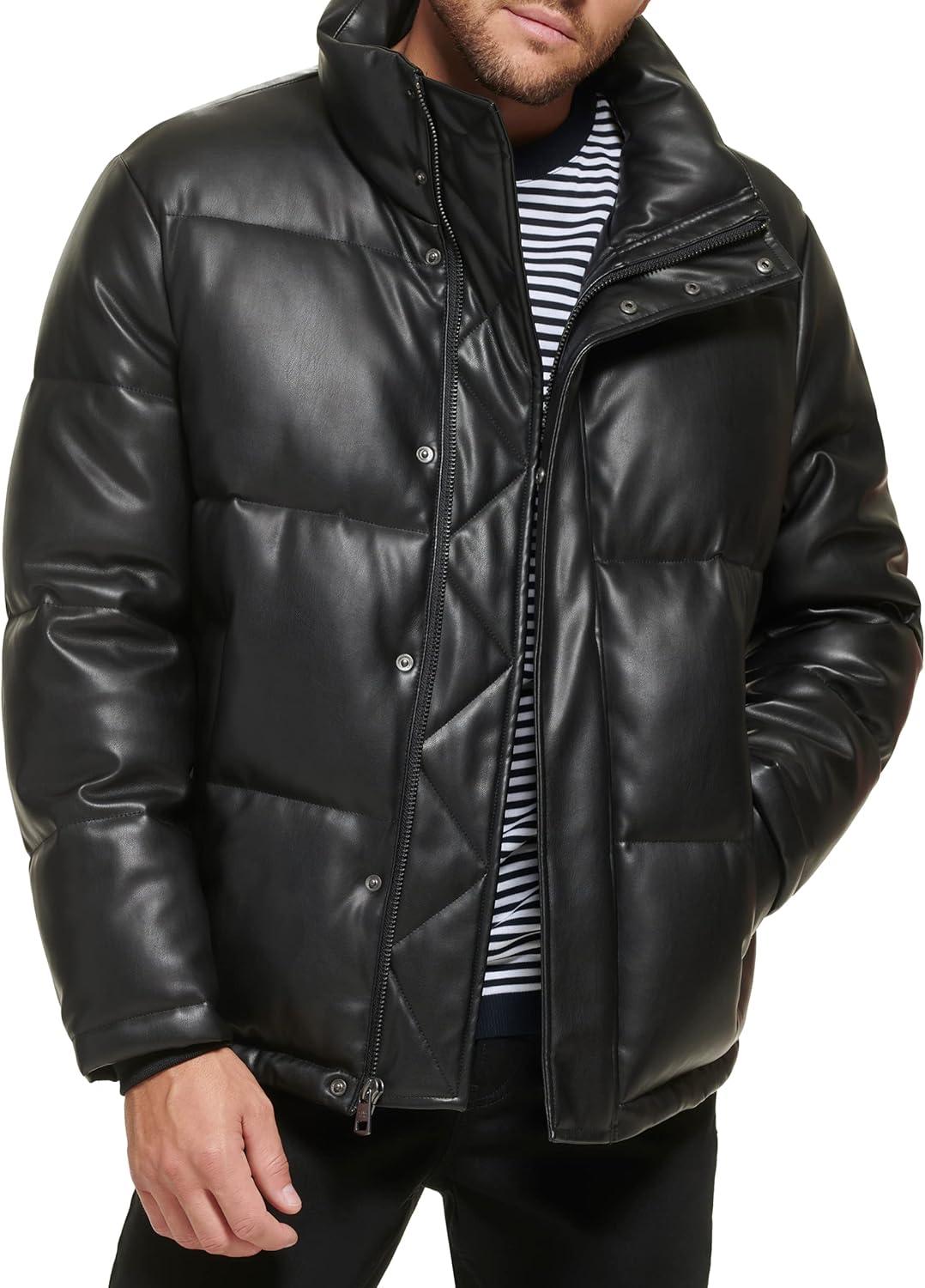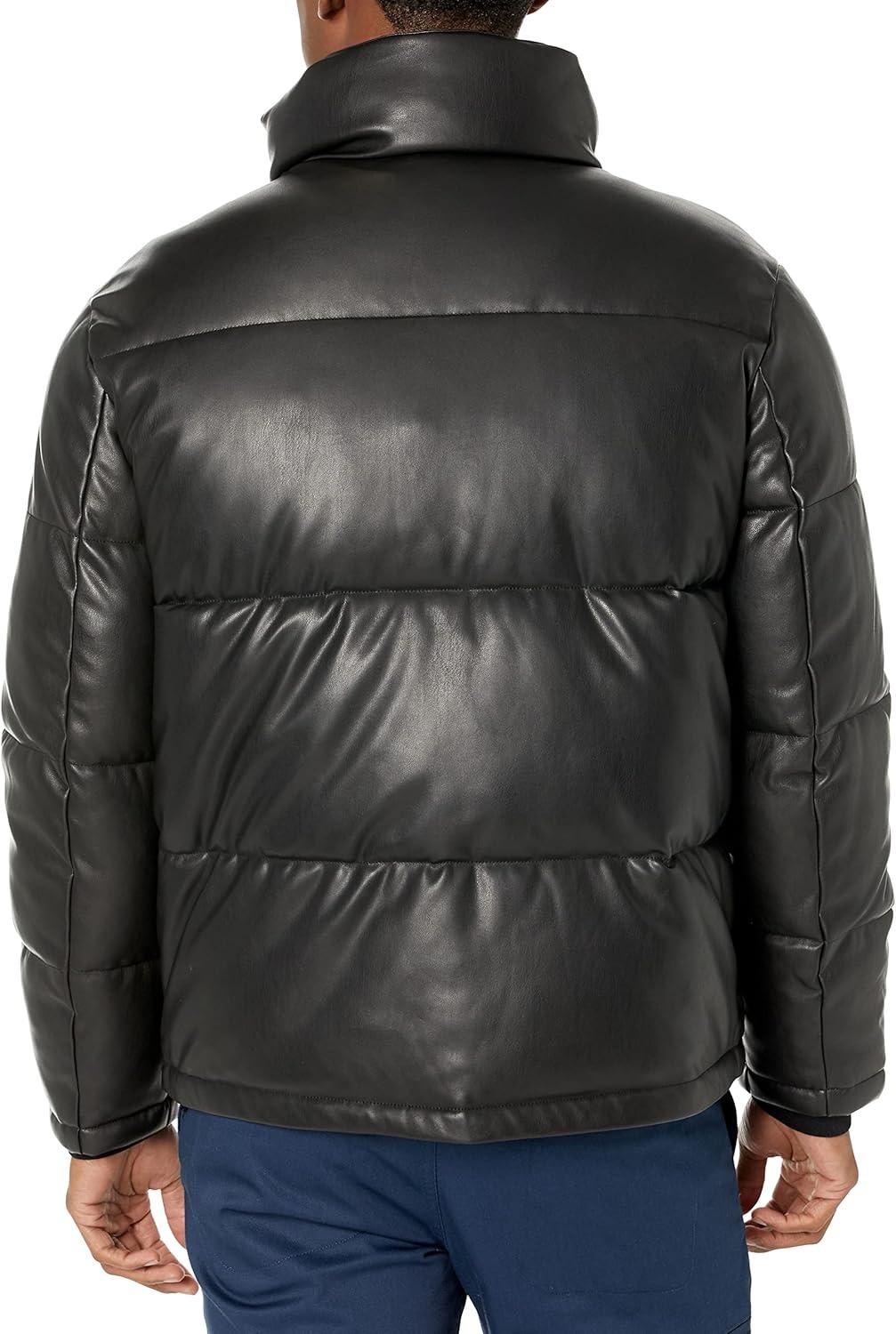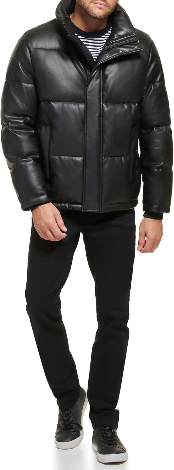 This Calvin Klein mens OUTERWEAR Faux Leather is a snap closure soft faux leather puffer jacket