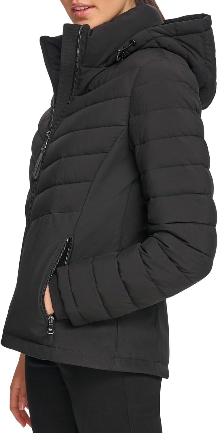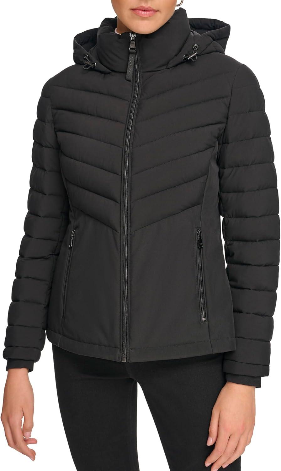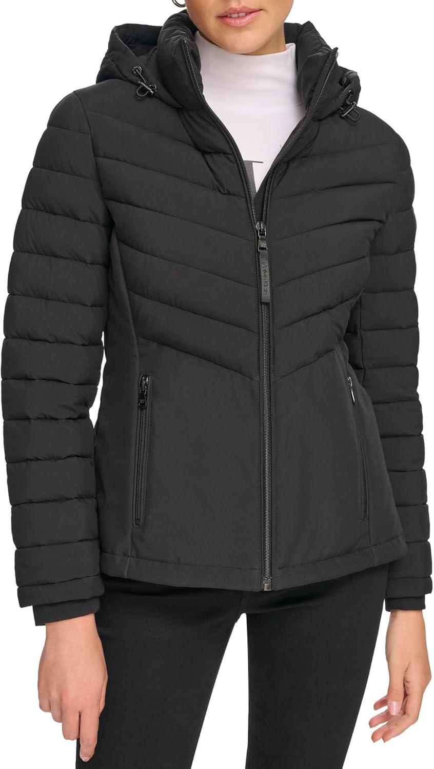 Calvin Klein Womens Classic Hooded Zip Front Puffer Coat(Light-weight Chevron Ebony)