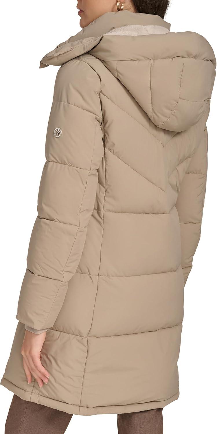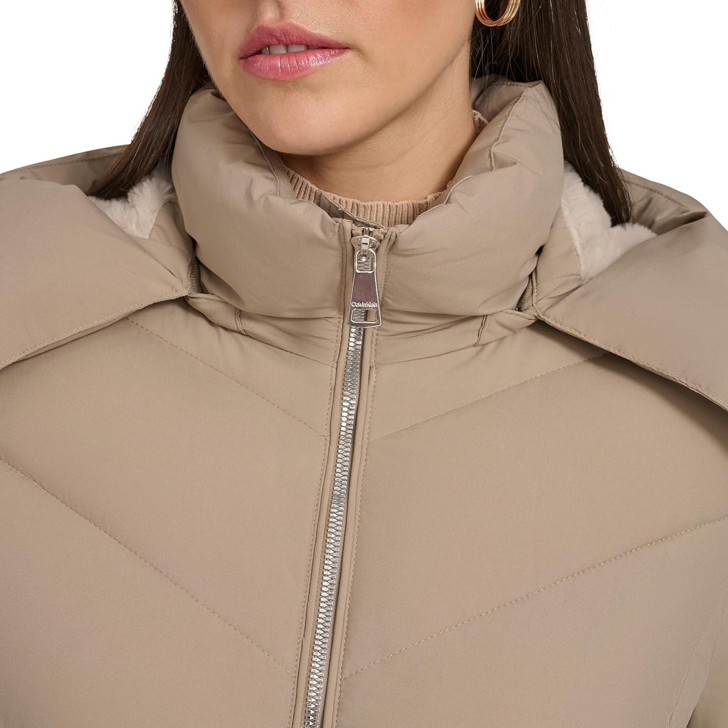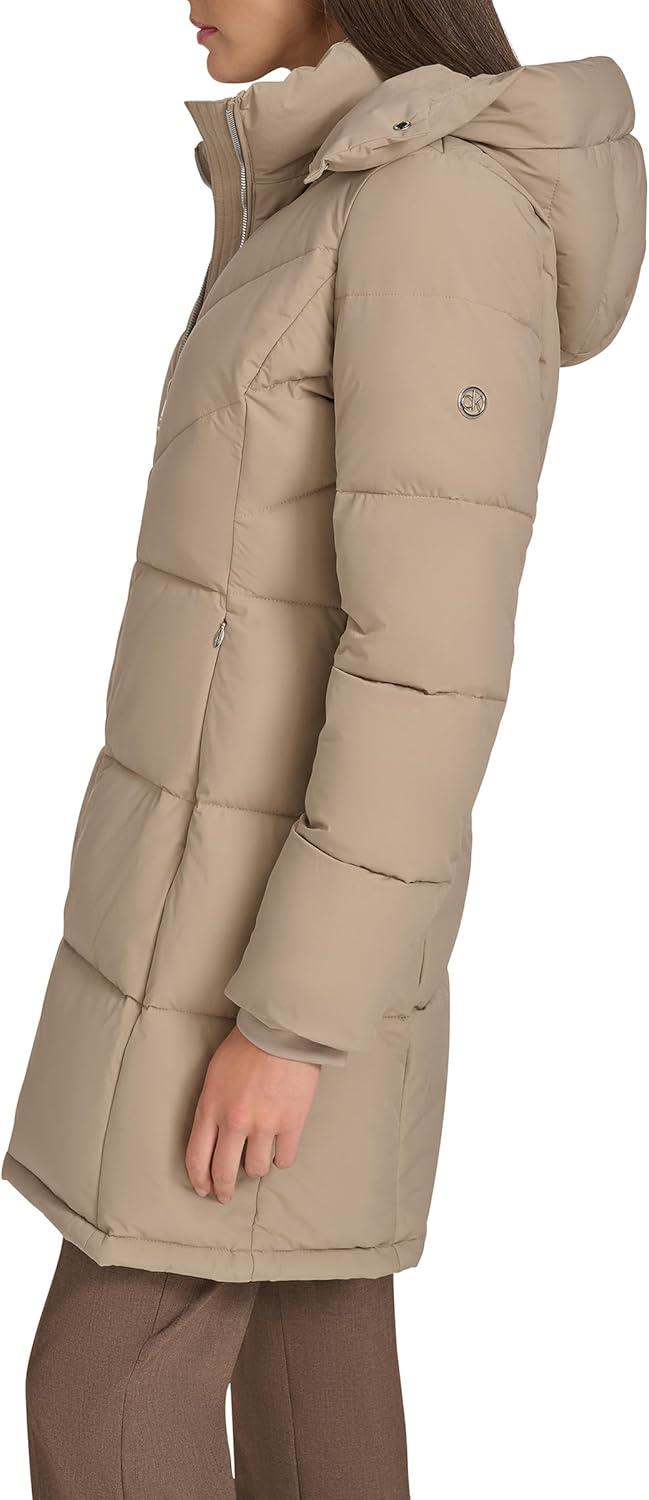 Calvin Klein Womens Hooded Zip Front Puffer Long Sleeve Coat(Birch)