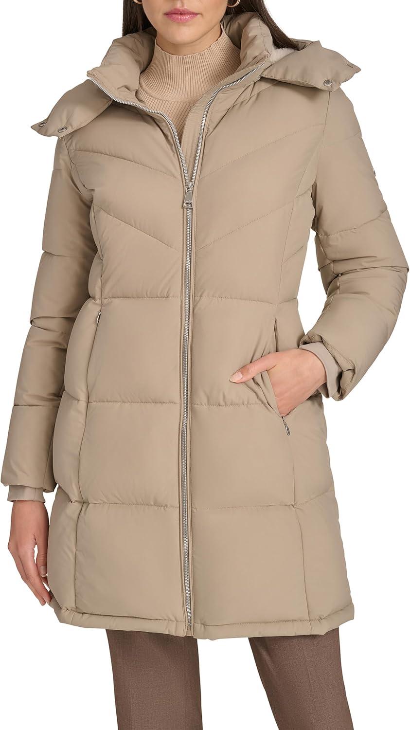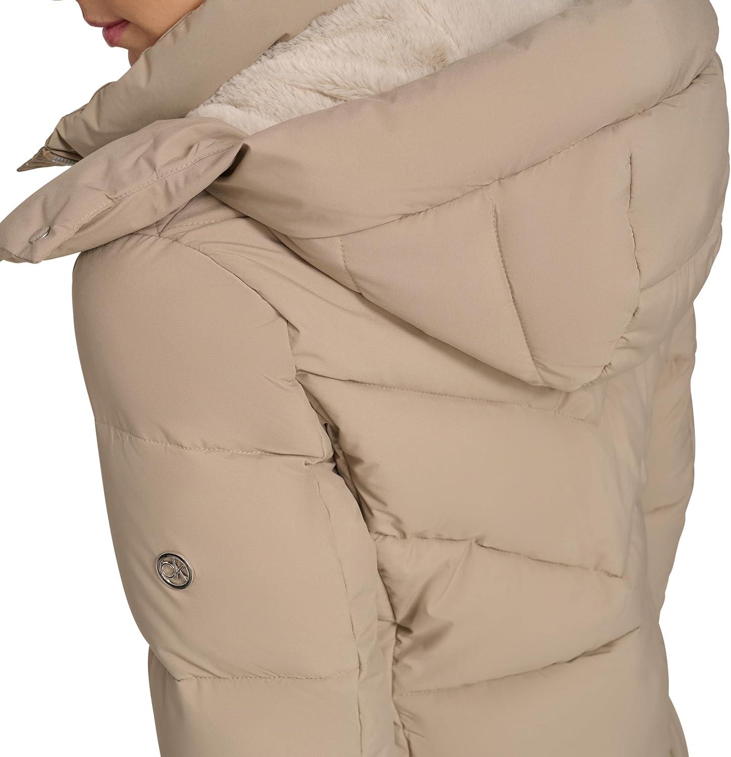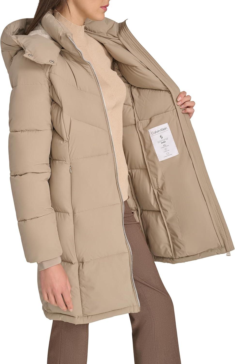 Calvin Klein Womens Hooded Zip Front Puffer Long Sleeve Coat(Birch)