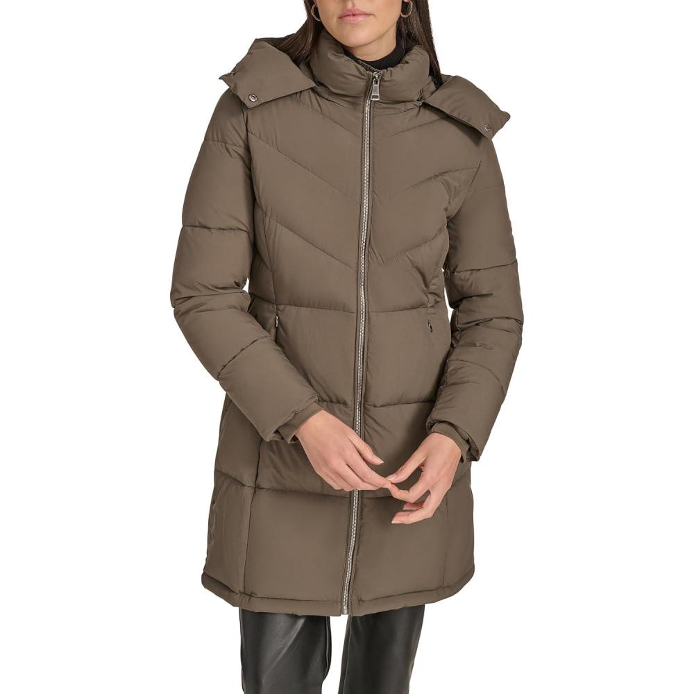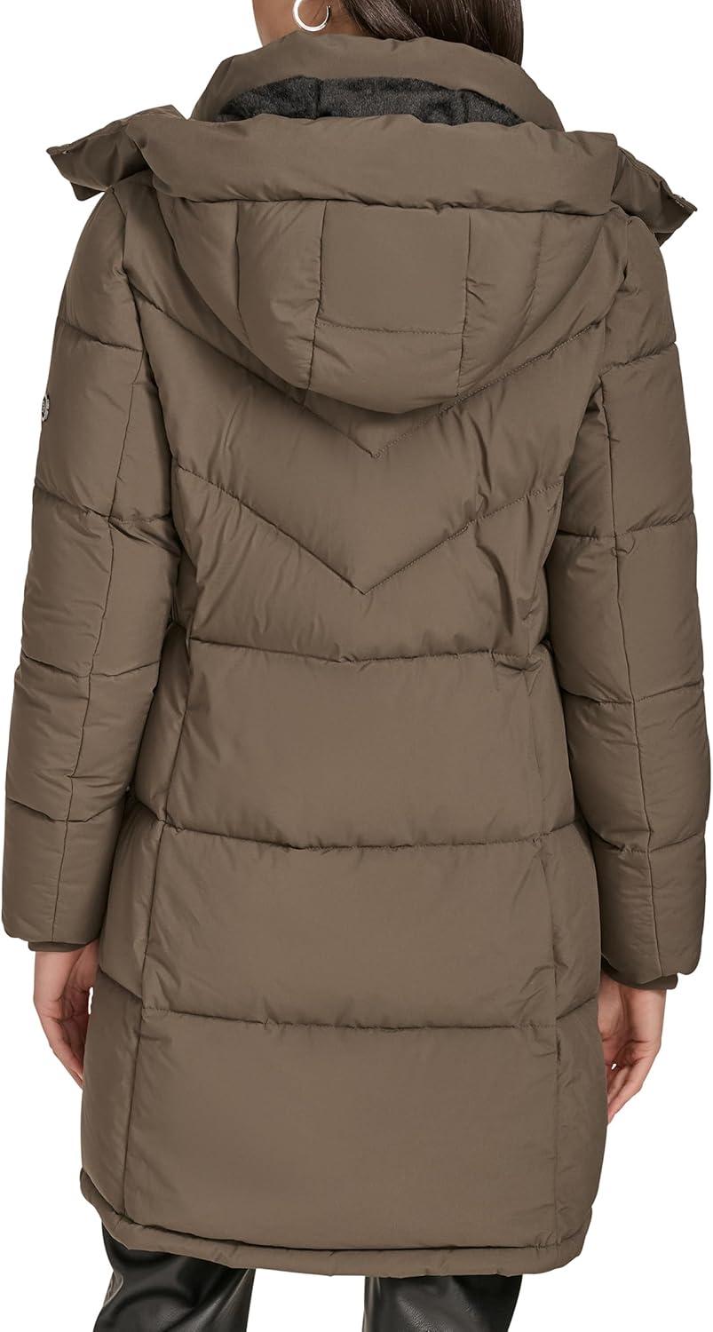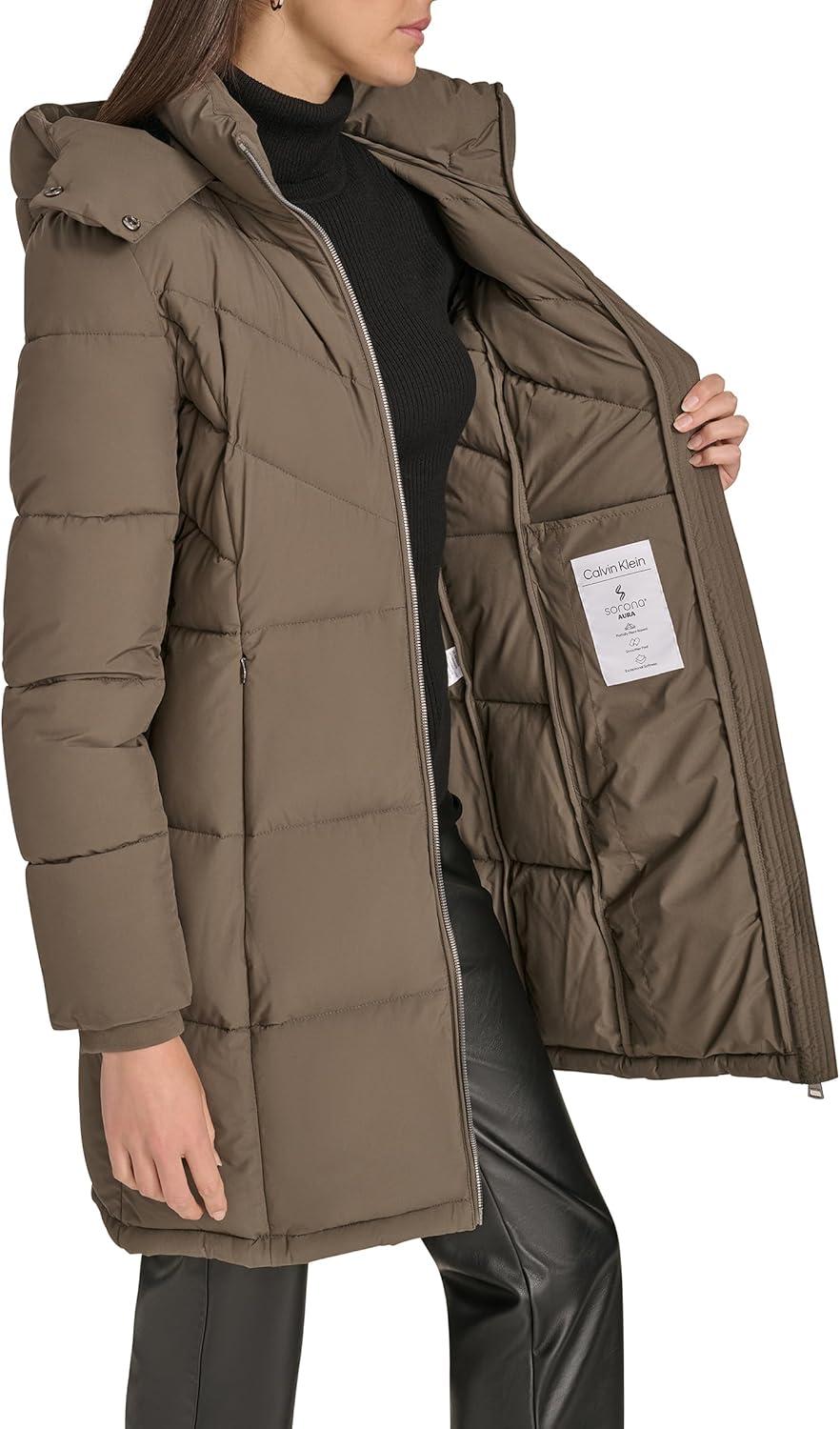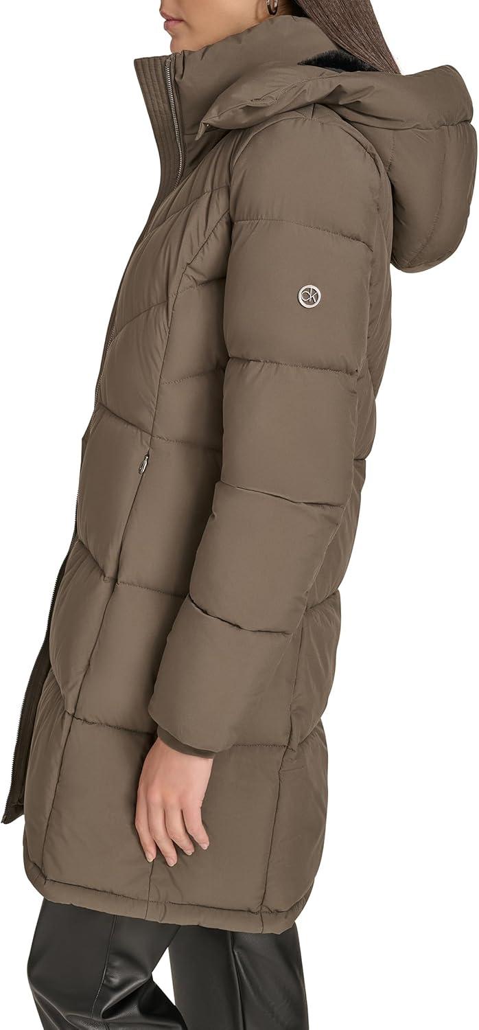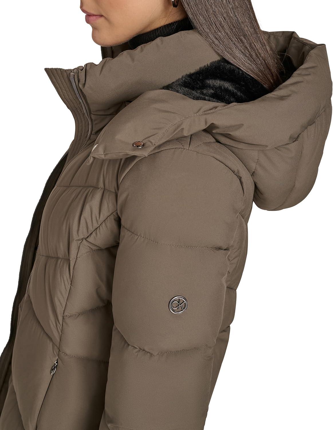 This Calvin Klein Women's Outerwear coat is a hooded zip front puffer cold weather long sleeve