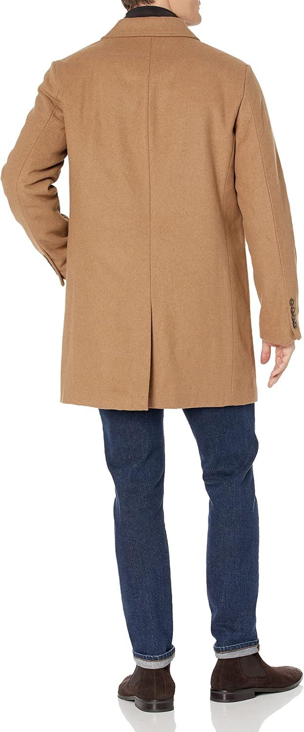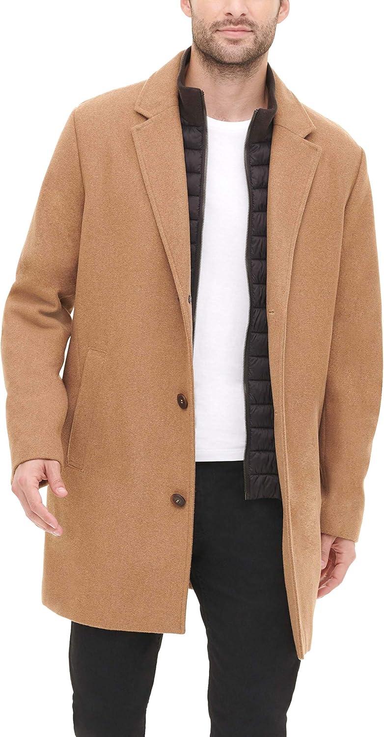 Wool blend top coat with nylon quilted bib with a dual front closure, zip front bib and three exterior buttons, A rib knit stand collar, quilted body lining, laydown lapels, non-functional button cuffs, two lower welt pockets and one interior welt zipper pocket.