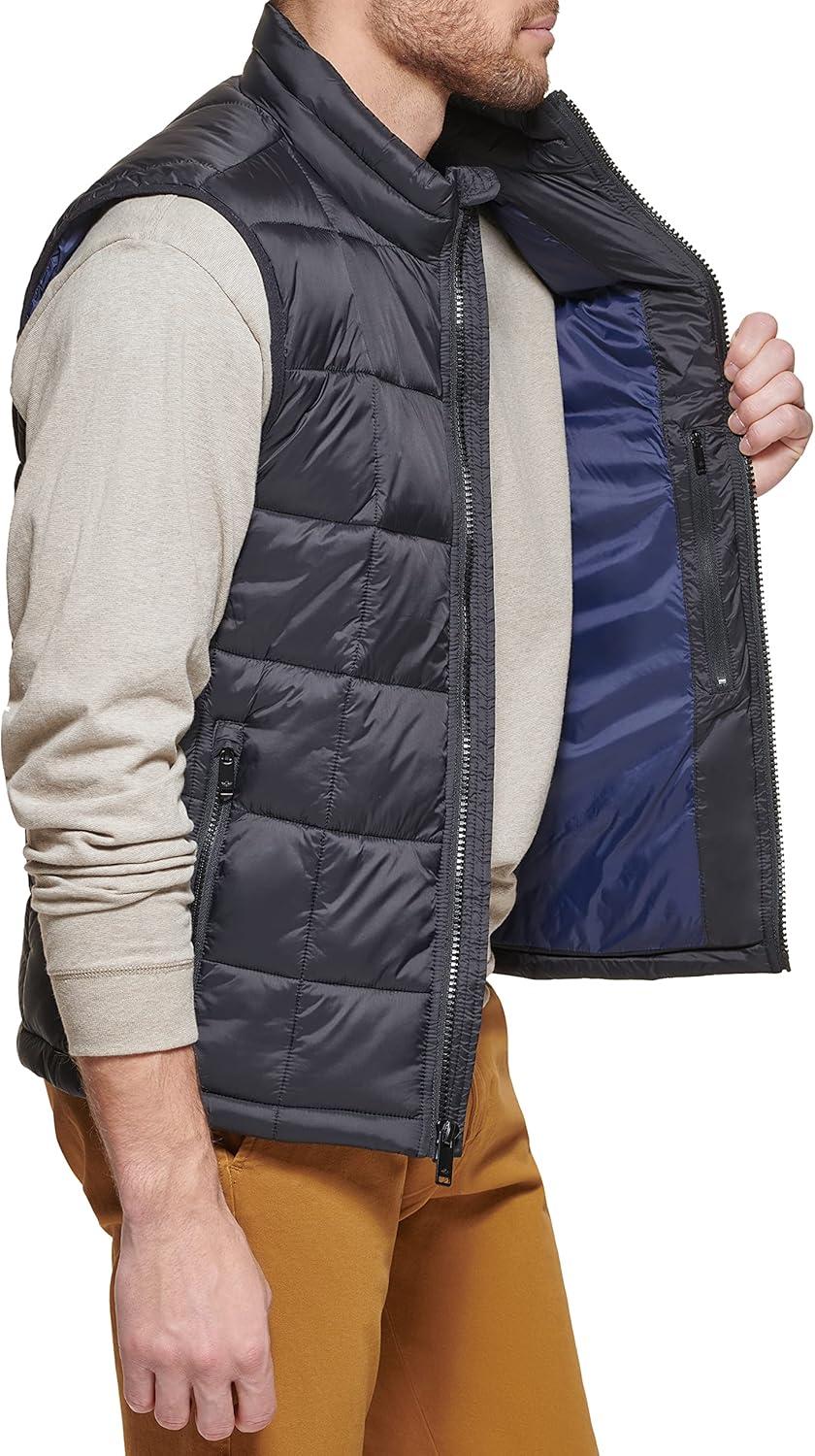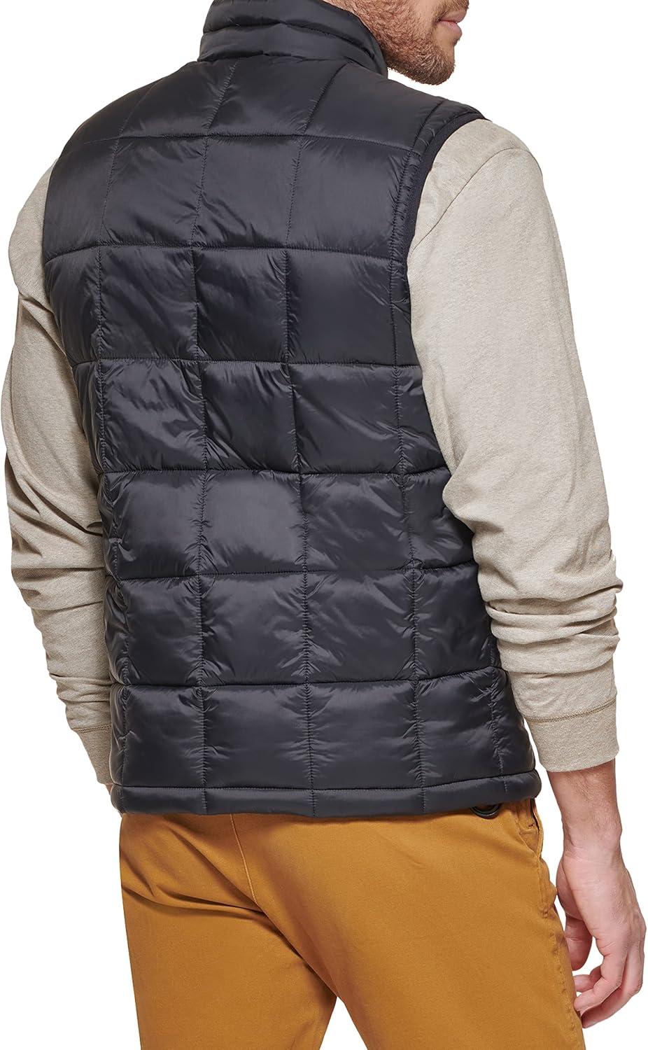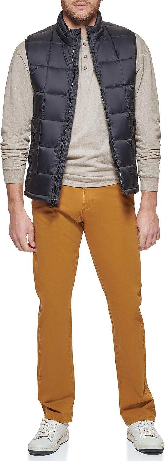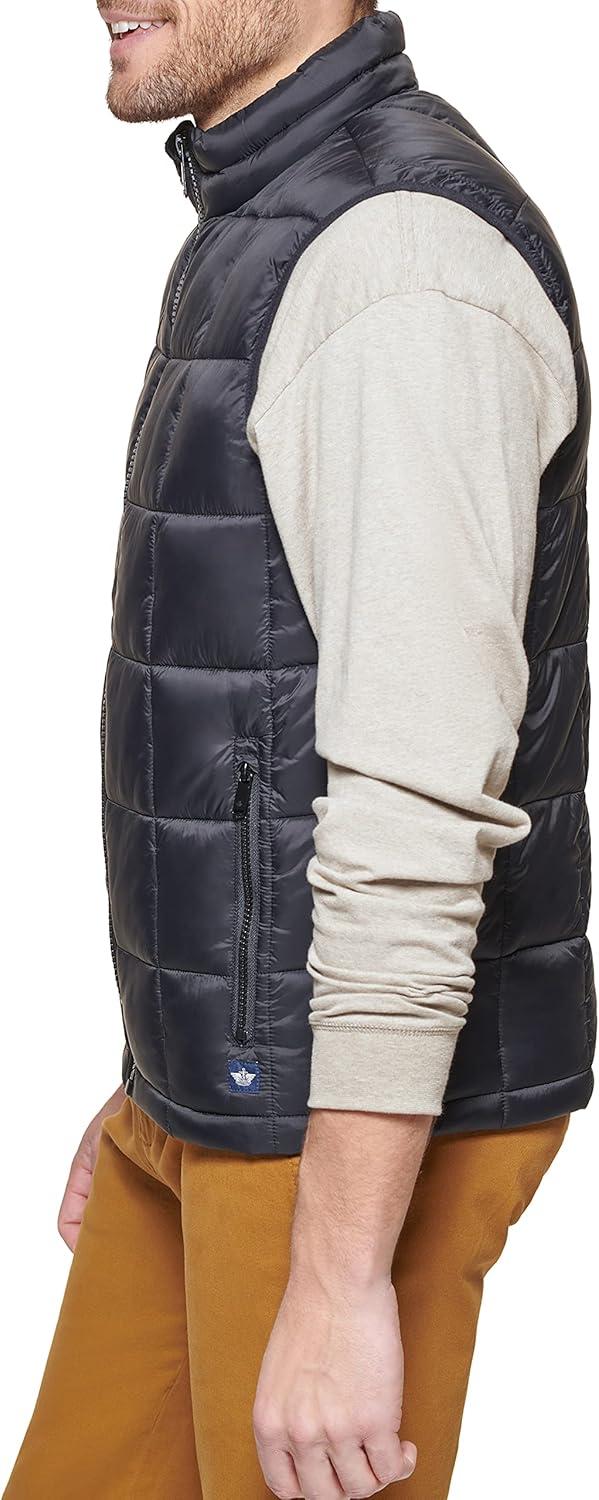 This box quilted puffer vest features is made from recycled fabrics. It features a center front zipper closure, two lower zipper pockets, recycled polyester interior fill for added warmth and insulation, and Dockers logo at lower left of body.