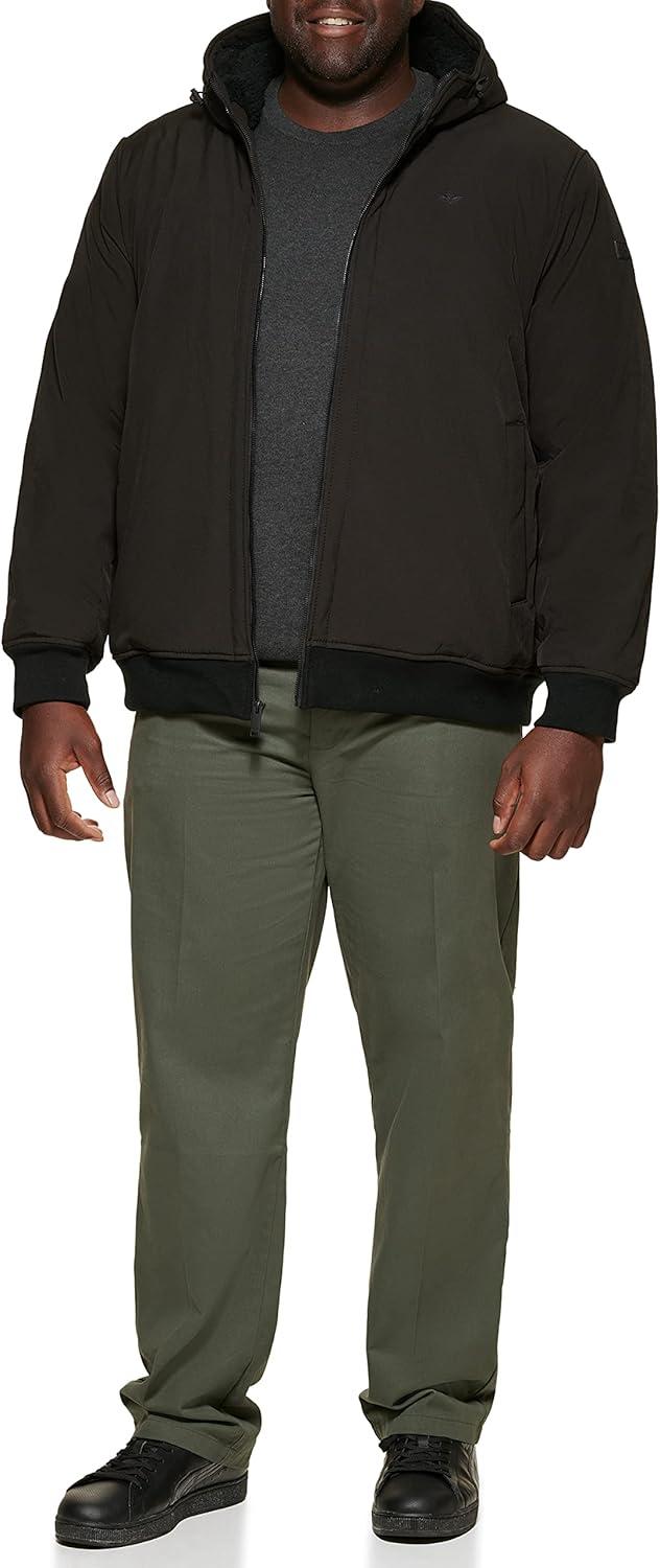 This Dockers Softshell Sherpa Lined Bomber Jacket features a center front zipper closure, soft rib knit cuffs and hem to trap in body heat, two lower pockets, and interior safety pocket, adjustable hood with sherpa lining, and a Dockers patch logo on the left sleeve.