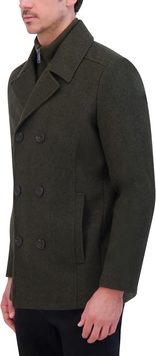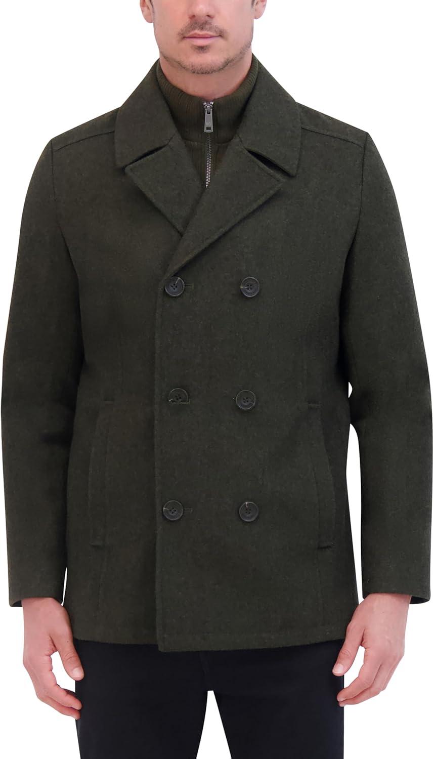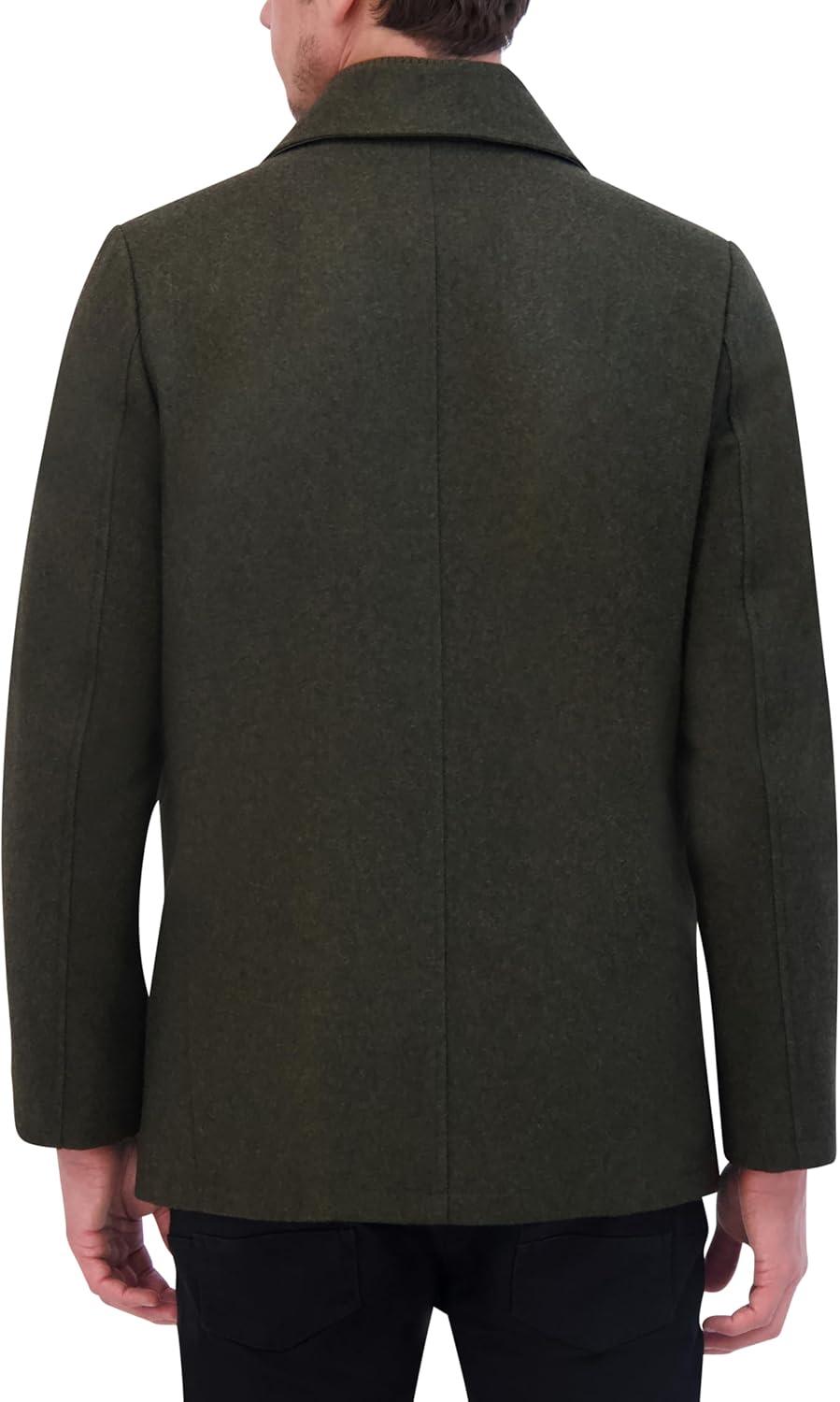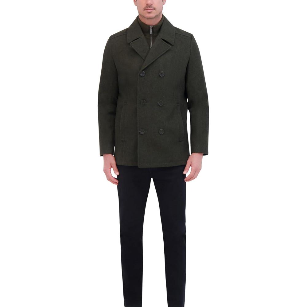 This Kenneth Cole Men's Men's Outerwear COAT is a Wool Pea Coat BUTTON FRONT CLOSURE Notched lapel SIDE ENTRY HAND POCKETS Knit Bib