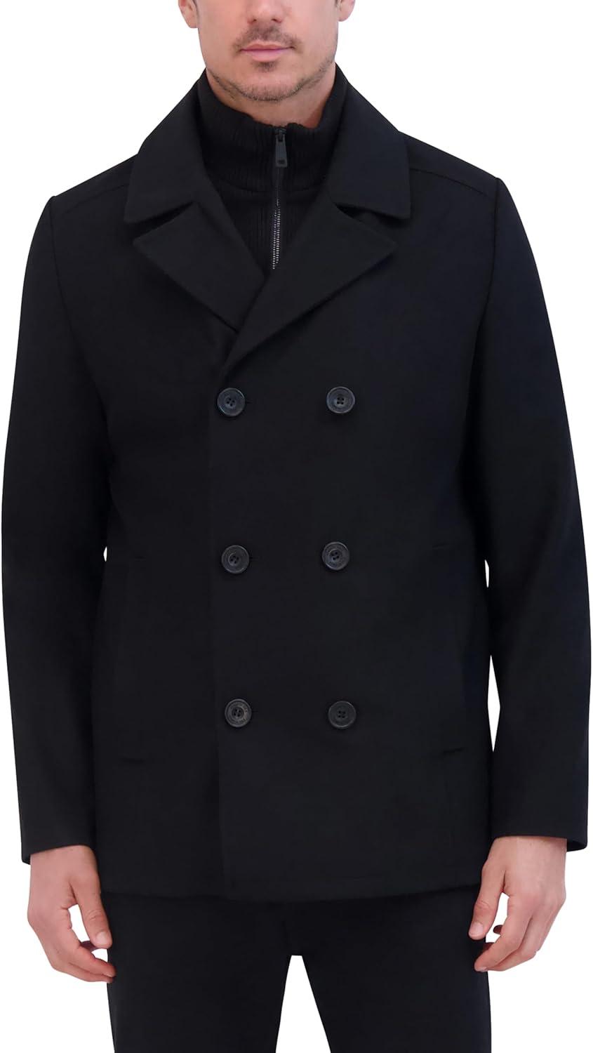 This Kenneth Cole Men's Men's Outerwear COAT is a Wool Pea Coat BUTTON FRONT CLOSURE Notched lapel SIDE ENTRY HAND POCKETS Knit Bib