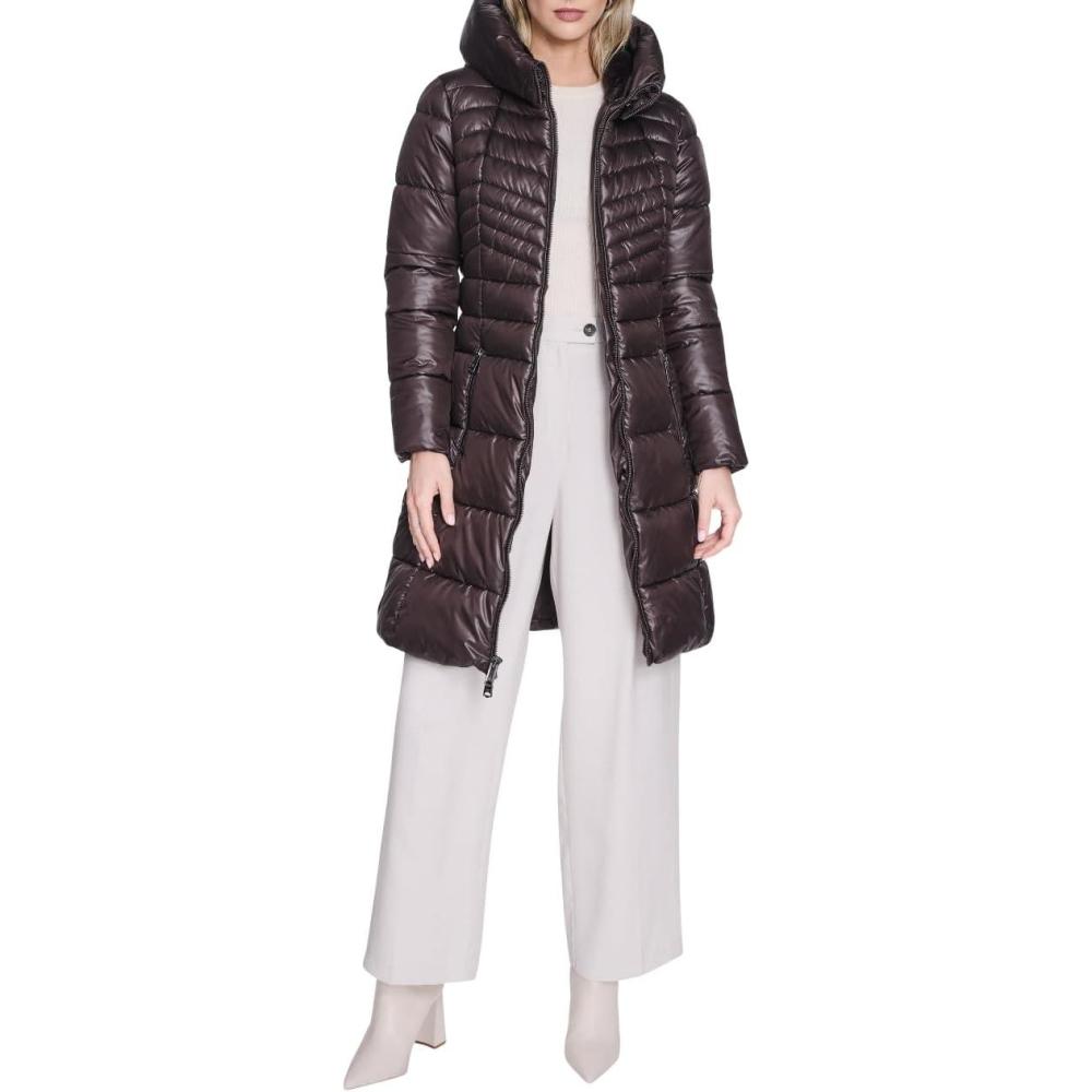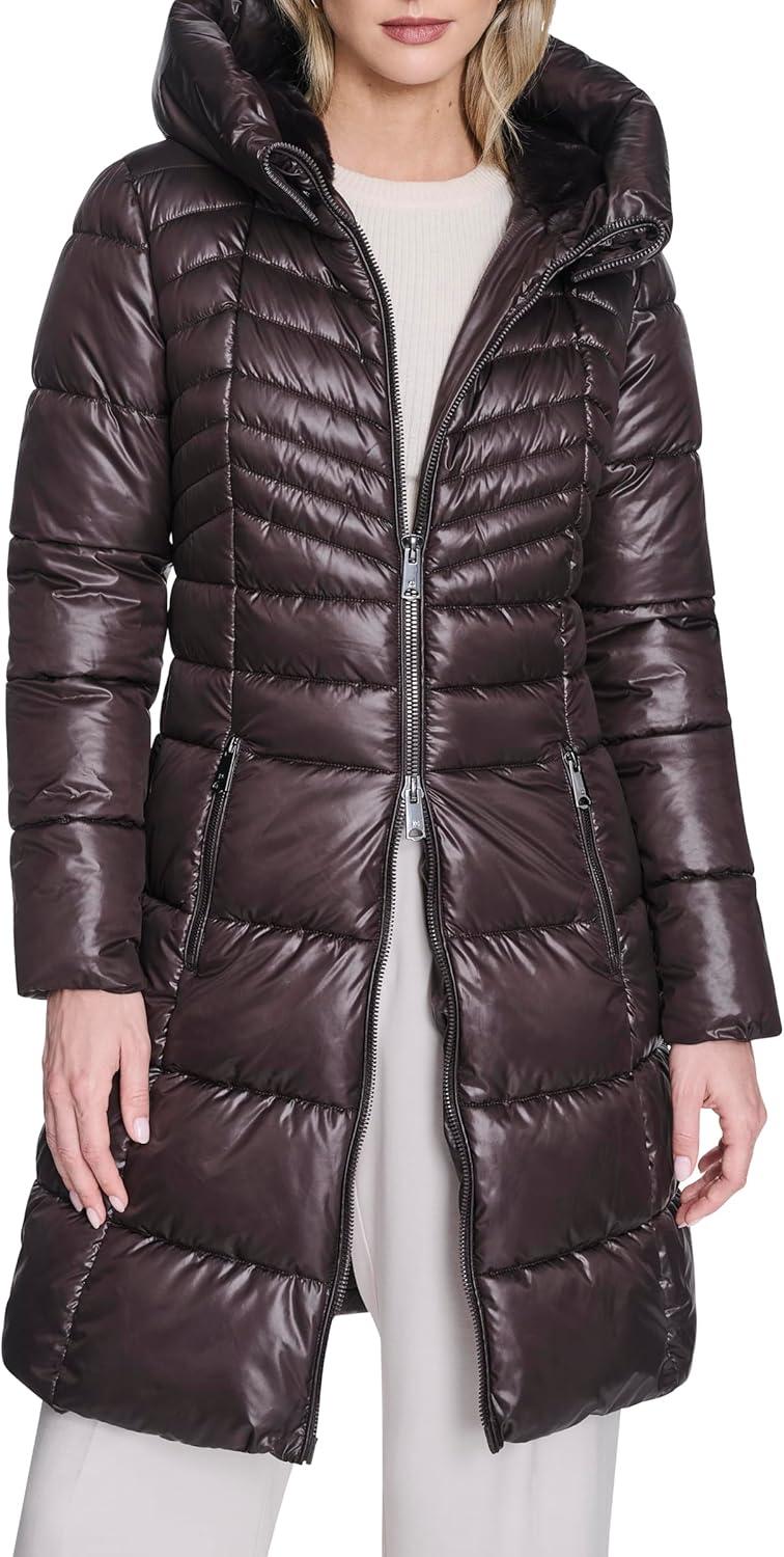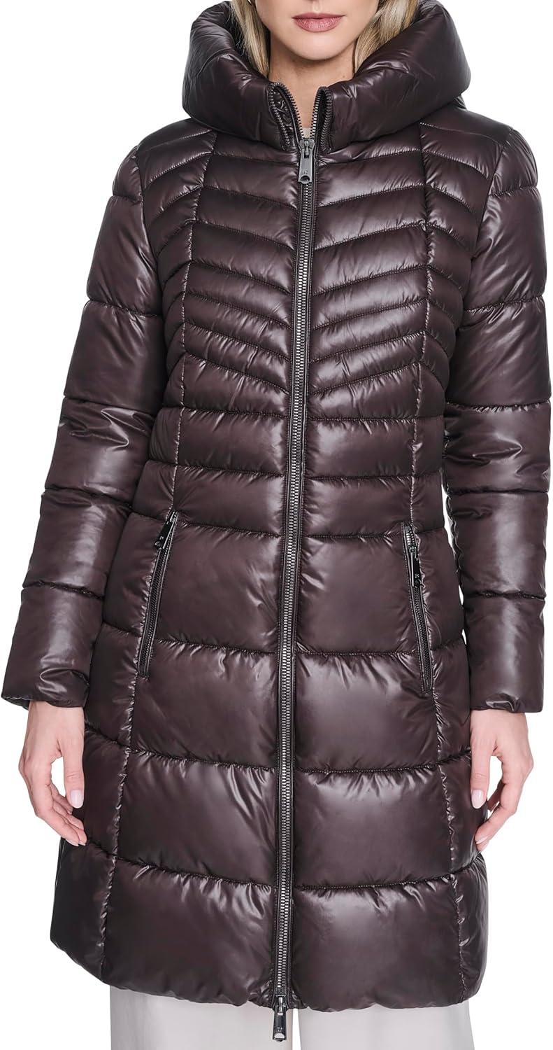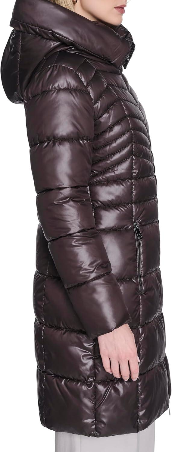 imageKenneth Cole womens Mid Length Mixed Quilted Puffer With Faux Fur Trimmed HoodChocolate