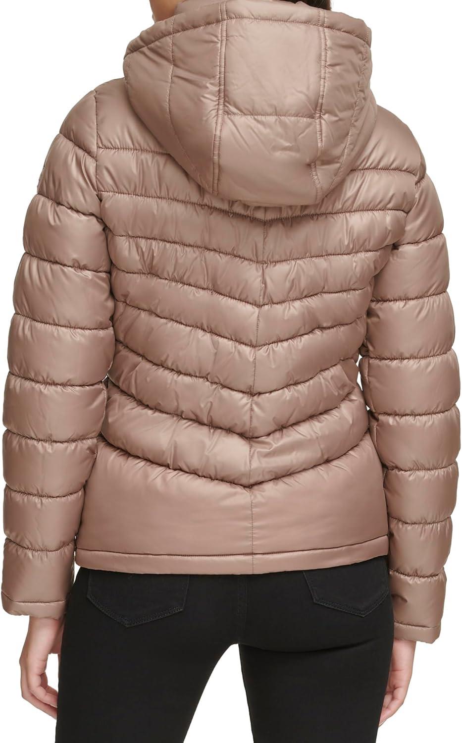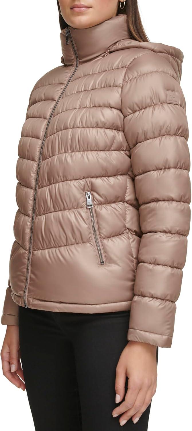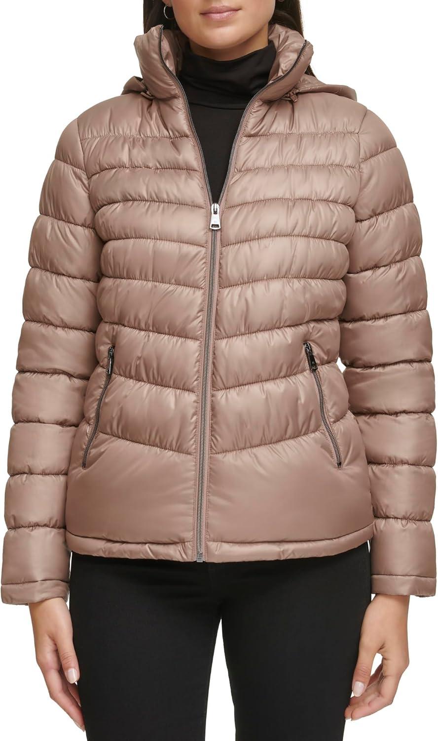 Kenneth Cole womens Solid Hooded Puffer Jacket(Hooded Packable Tan)