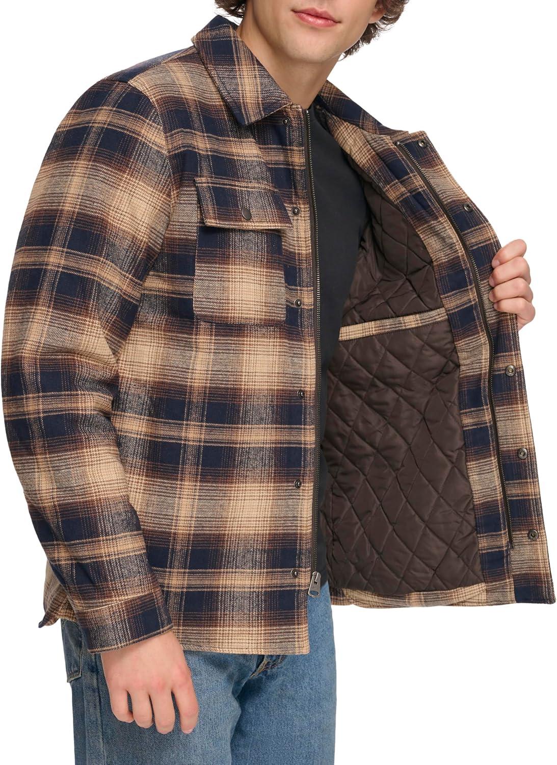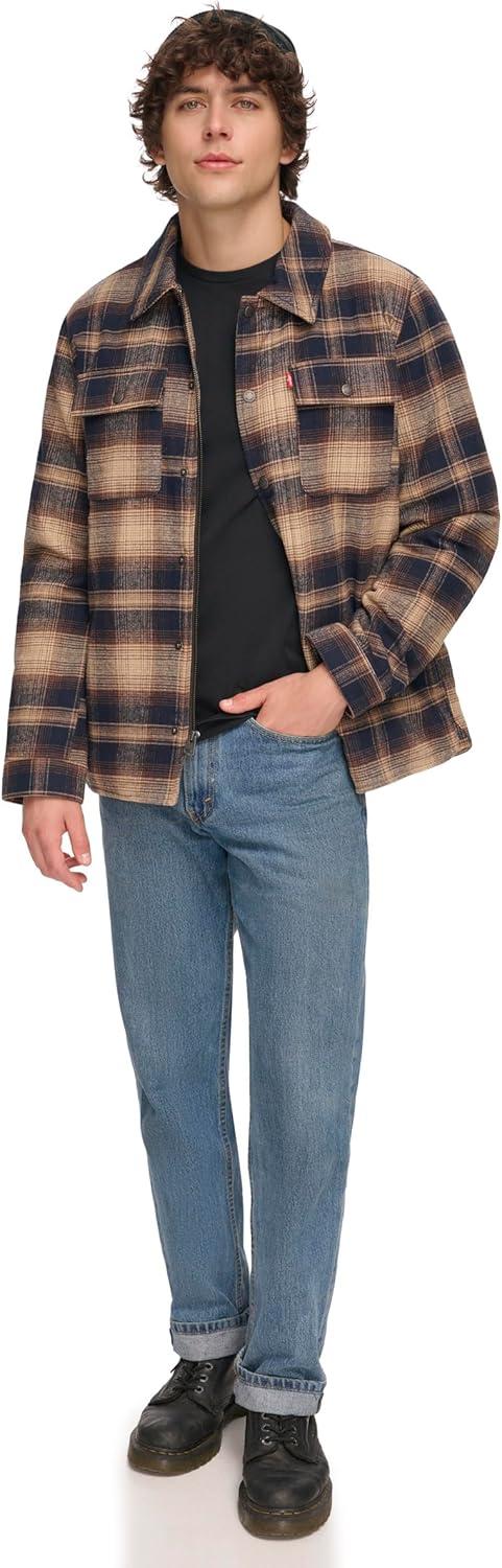 Stay warm and stylish with this Levi's Men's Cotton Plaid Shirt Jacket, designed for versatile layering in any season. The quilted lining and light fill provide just the right amount of warmth for cool fall nights, while the soft and durable cotton plaid fabric ensures all-day comfort. Functional features like the dual zipper and button-front closure offer flexibility, and the two upper chest flap pockets and lower welt pockets provide convenient storage. Adjustable snap cuffs add an extra touch of customization. Crafted with Levi's signature high-quality materials, this classic shirt jacket is complete with the iconic Levi's red tab on the wearer's left chest pocket. The model is 6'1″ and wears a size medium, providing a helpful sizing reference.