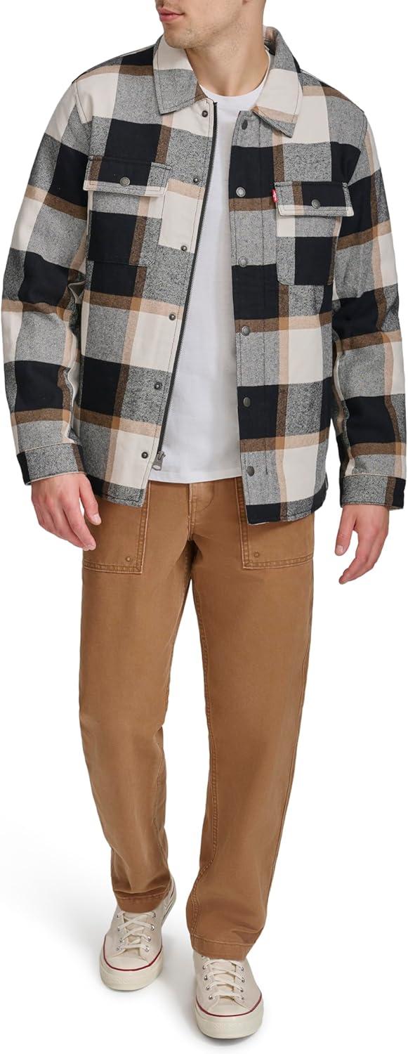 Stay warm and stylish with this Levi's Men's Cotton Plaid Shirt Jacket, designed for versatile layering in any season. The quilted lining and light fill provide just the right amount of warmth for cool fall nights, while the soft and durable cotton plaid fabric ensures all-day comfort. Functional features like the dual zipper and button-front closure offer flexibility, and the two upper chest flap pockets and lower welt pockets provide convenient storage. Adjustable snap cuffs add an extra touch of customization. Crafted with Levi's signature high-quality materials, this classic shirt jacket is complete with the iconic Levi's red tab on the wearer's left chest pocket. The model is 6'1″ and wears a size medium, providing a helpful sizing reference.