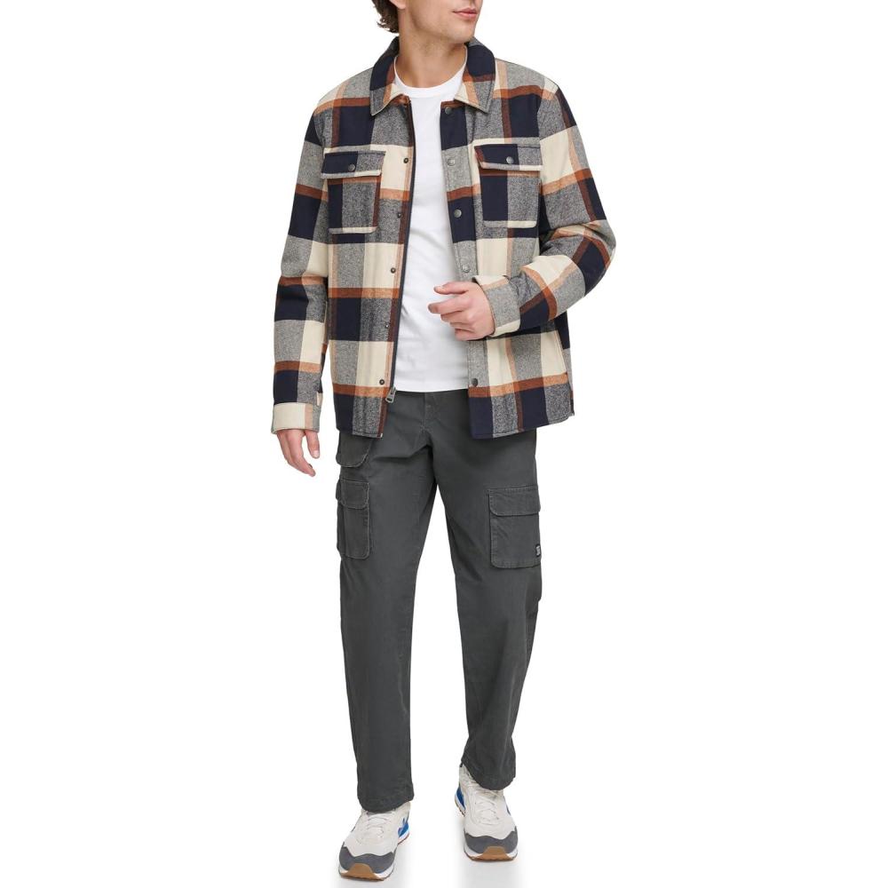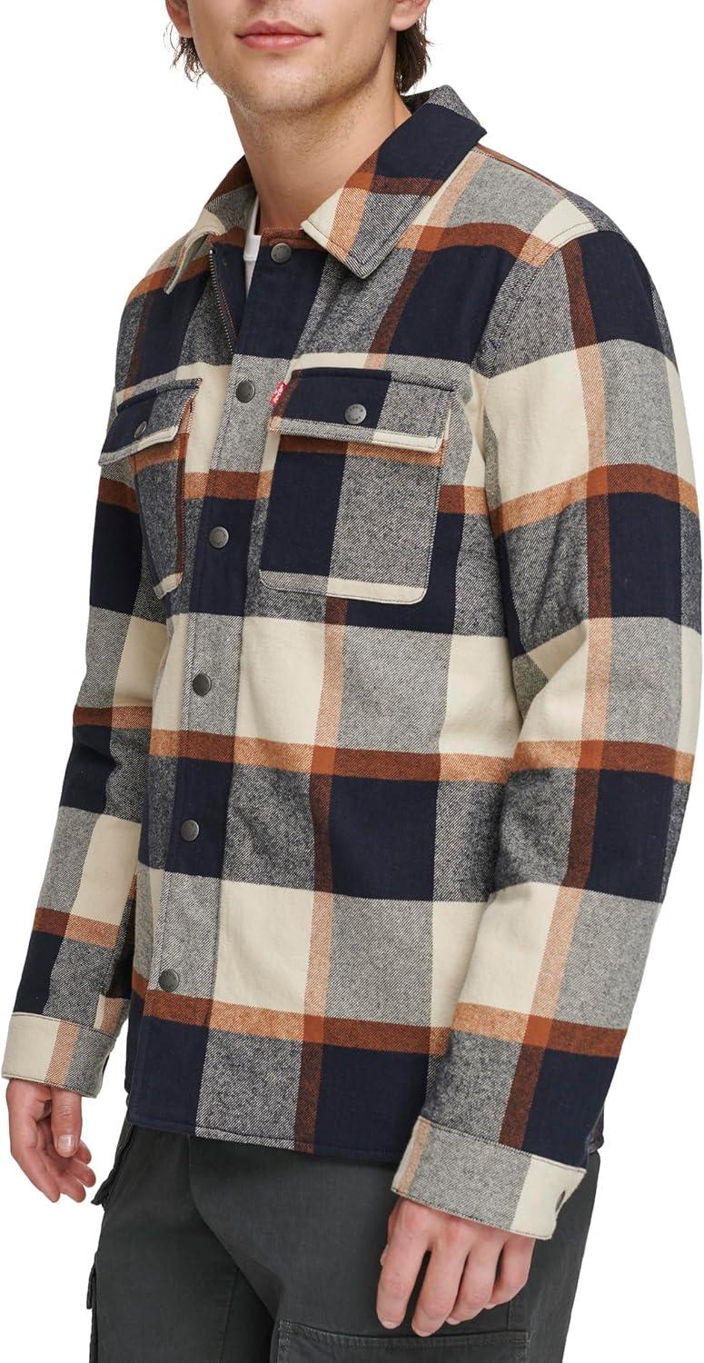 Stay warm and stylish with this Levi's Men's Cotton Plaid Shirt Jacket, designed for versatile layering in any season. The quilted lining and light fill provide just the right amount of warmth for cool fall nights, while the soft and durable cotton plaid fabric ensures all-day comfort. Functional features like the dual zipper and button-front closure offer flexibility, and the two upper chest flap pockets and lower welt pockets provide convenient storage. Adjustable snap cuffs add an extra touch of customization. Crafted with Levi's signature high-quality materials, this classic shirt jacket is complete with the iconic Levi's red tab on the wearer's left chest pocket. The model is 6'1″ and wears a size medium, providing a helpful sizing reference.