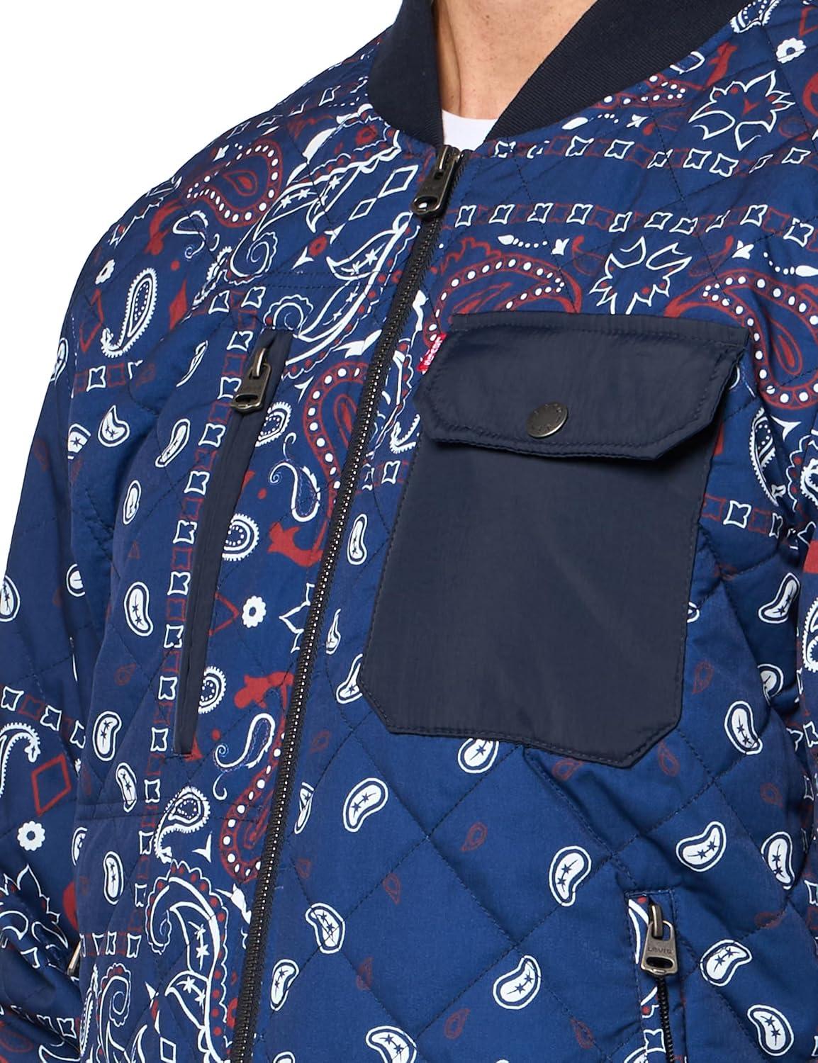 Lightweight diamond quilted bomber jacket, Soft rib knit collar, cuffs and hem for comfort, Center front zipper closure, Multiple pockets for convenience; two lower hand zipper pockets, one chest zipper pocket, one chest flap pocket with snap closure and one interior safety pocket, Classic Levi’s Red Tab on front chest pocket