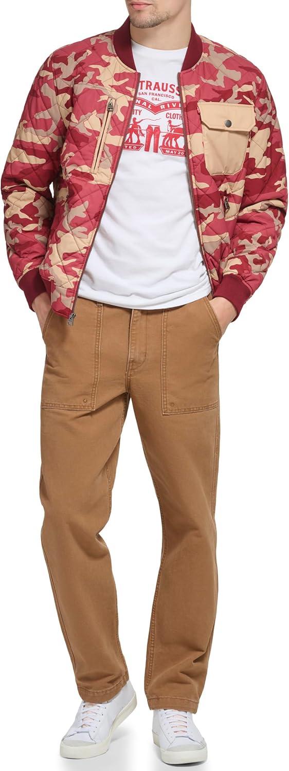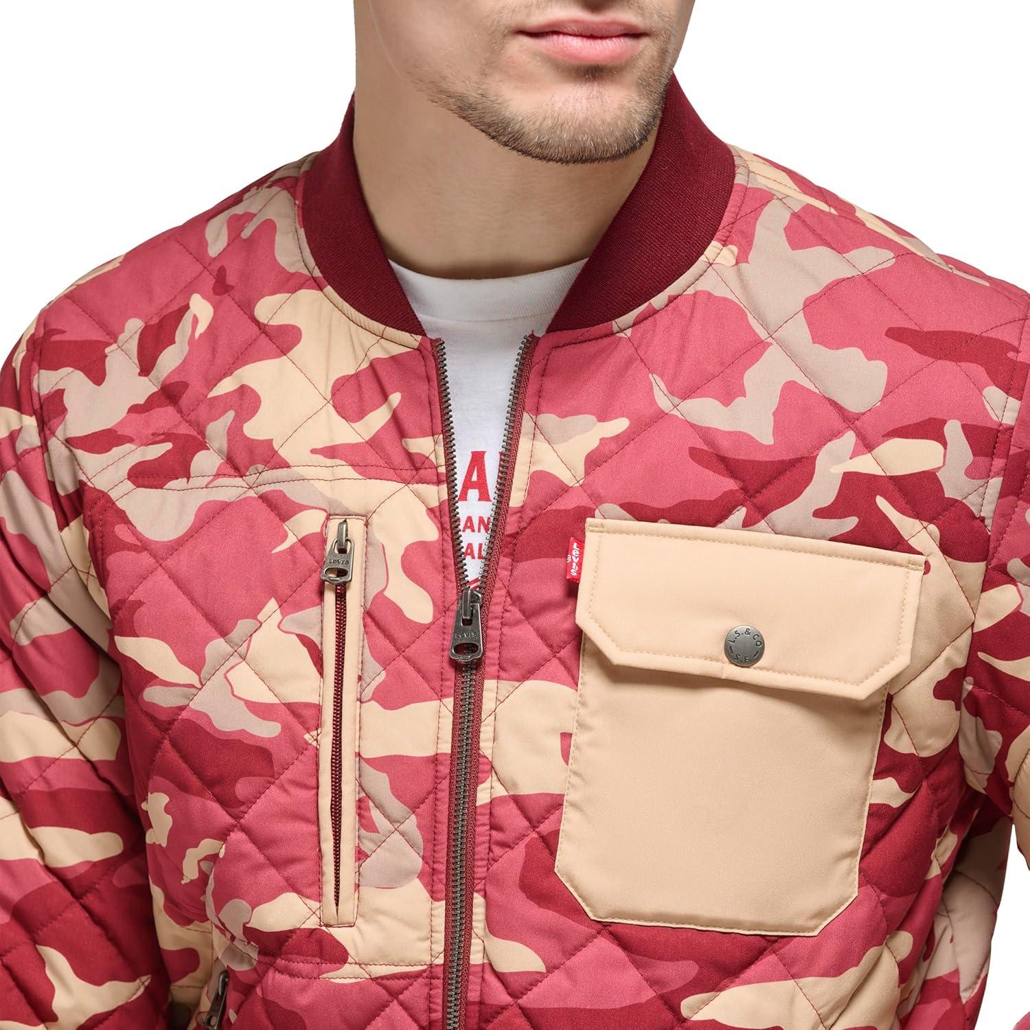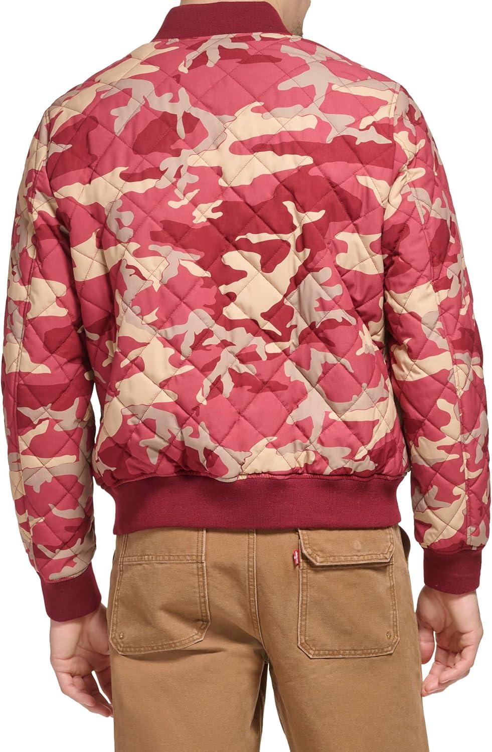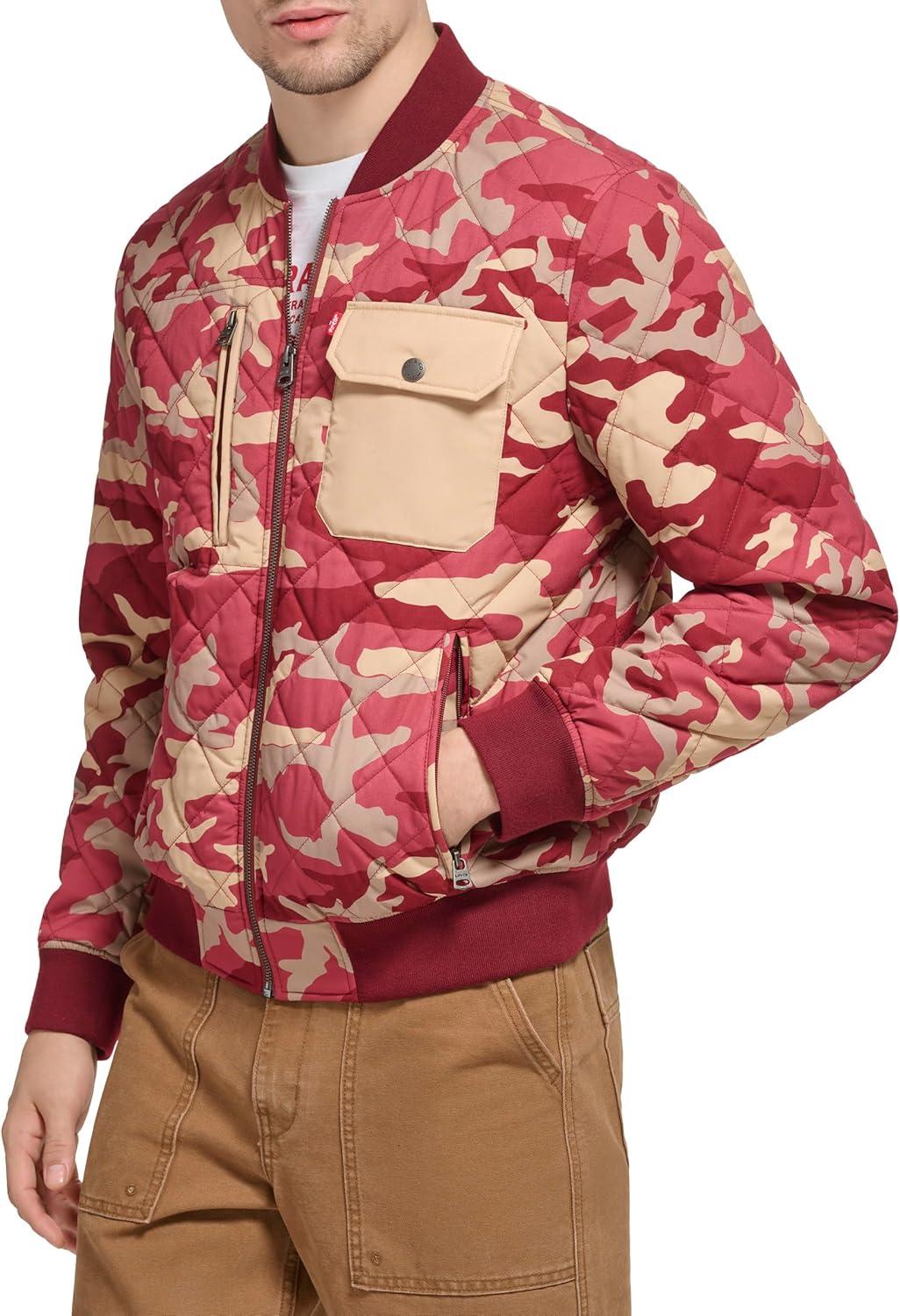 Lightweight diamond quilted bomber jacket, Soft rib knit collar, cuffs and hem for comfort, Center front zipper closure, Multiple pockets for convenience; two lower hand zipper pockets, one chest zipper pocket, one chest flap pocket with snap closure and one interior safety pocket, Classic Levi’s Red Tab on front chest pocket