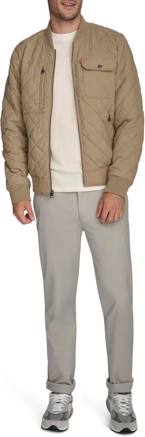 Lightweight diamond quilted bomber jacket, Soft rib knit collar, cuffs and hem for comfort, Center front zipper closure, Multiple pockets for convenience; two lower hand zipper pockets, one chest zipper pocket, one chest flap pocket with snap closure and one interior safety pocket, Classic Levi’s Red Tab on front chest pocket