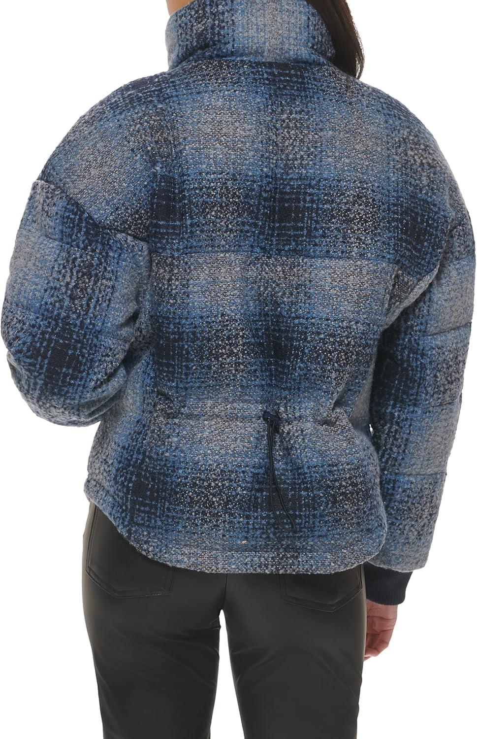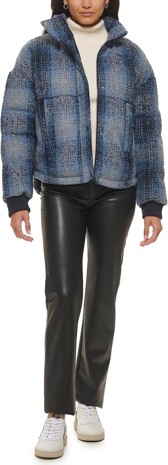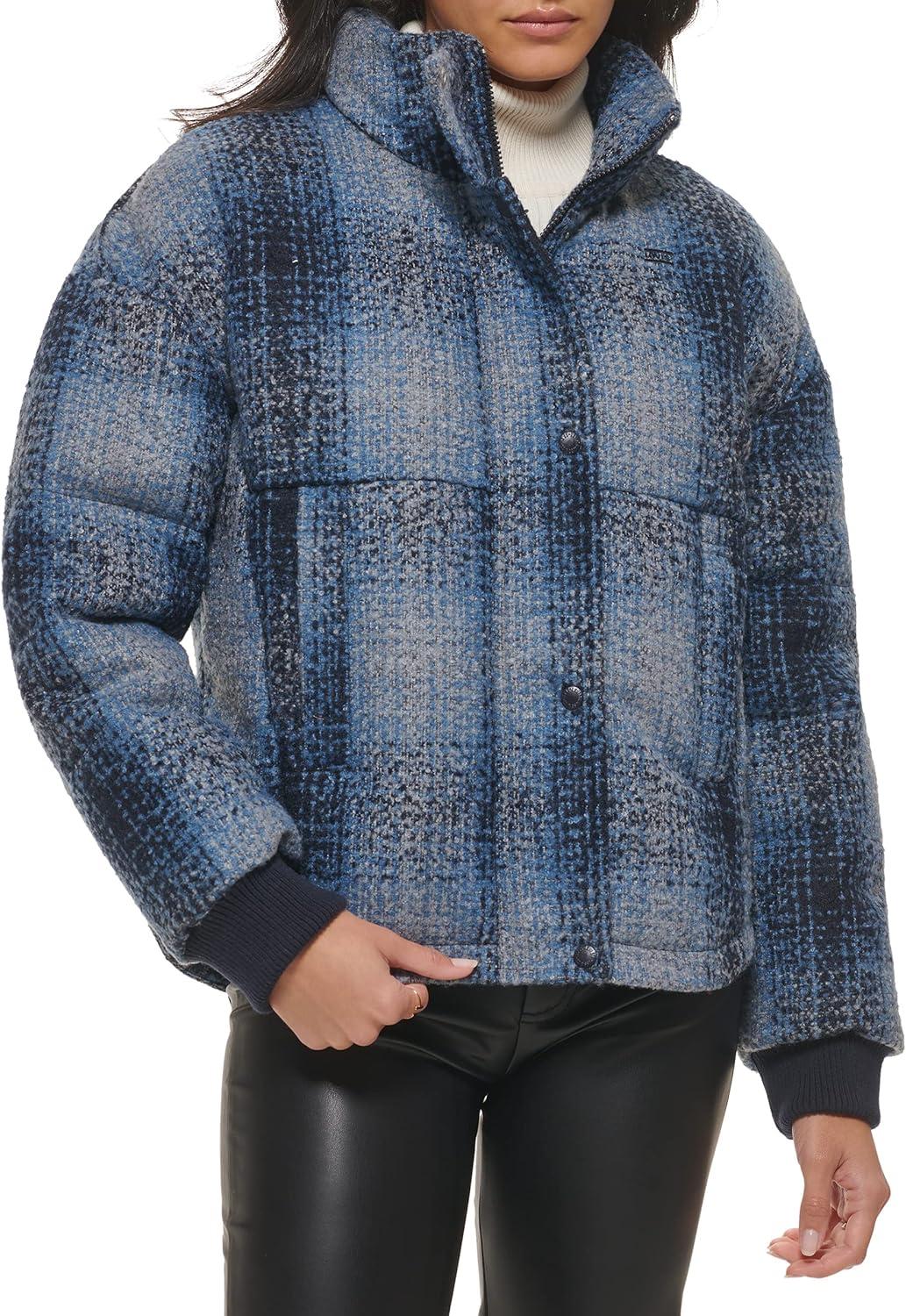 Levi’s womens Cinch Waist Puffer Jacket(Blue Ombre Wool Plaid)